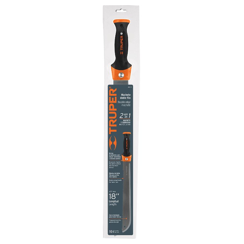 Мачете Double Edge, довжина 440 мм. Виготовлене з високоякісної інструментальної сталі S50C. Лезо товщиною 2 мм має антикорозійне покриття. Пилка зі зворотнього боку леза робить мачете незамінним помічником у туристичному поході, а також при зборі деяких сільськогосподарських культур. Ергономічна прогумована ручка забезпечує зручний та надійний хват.