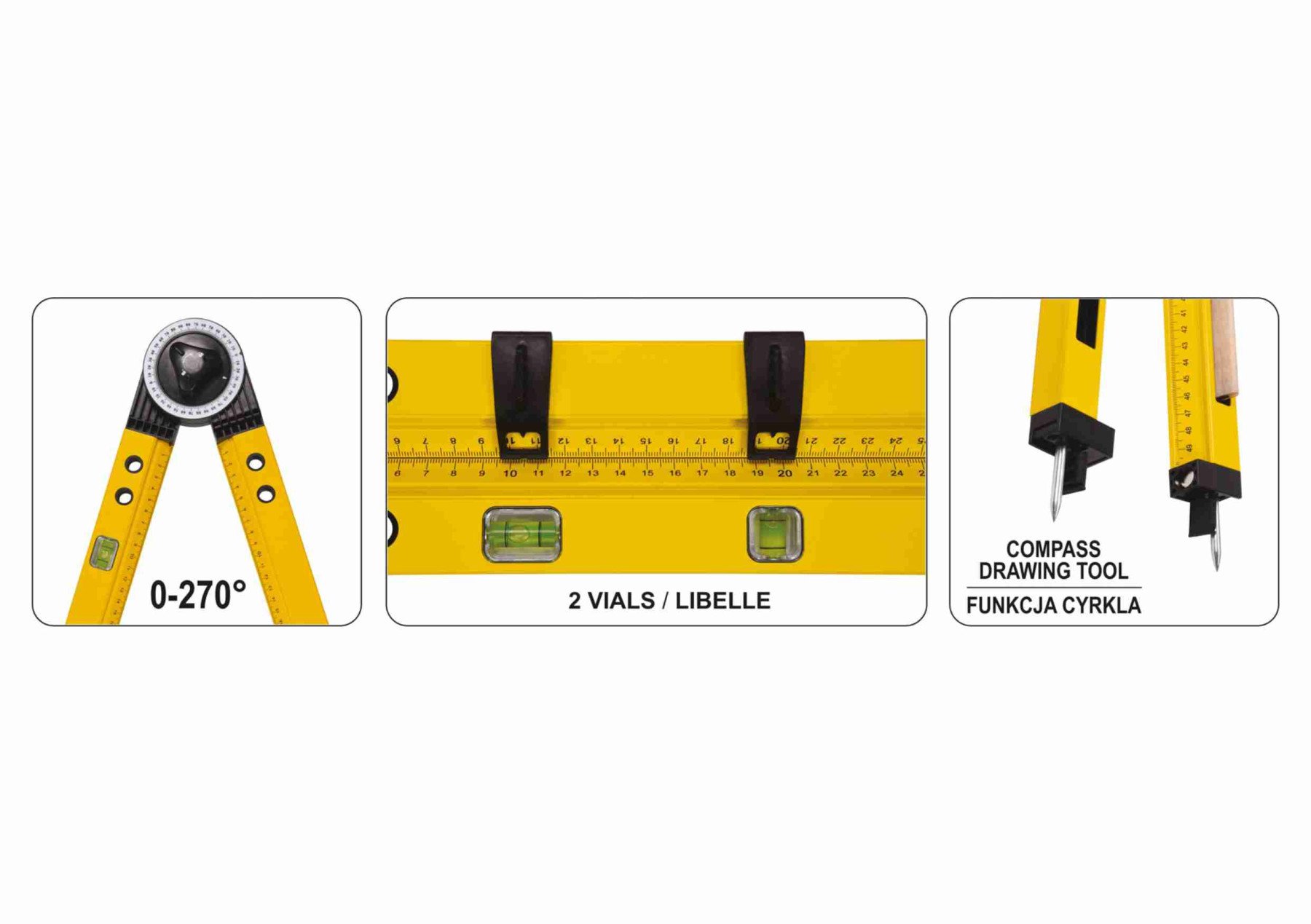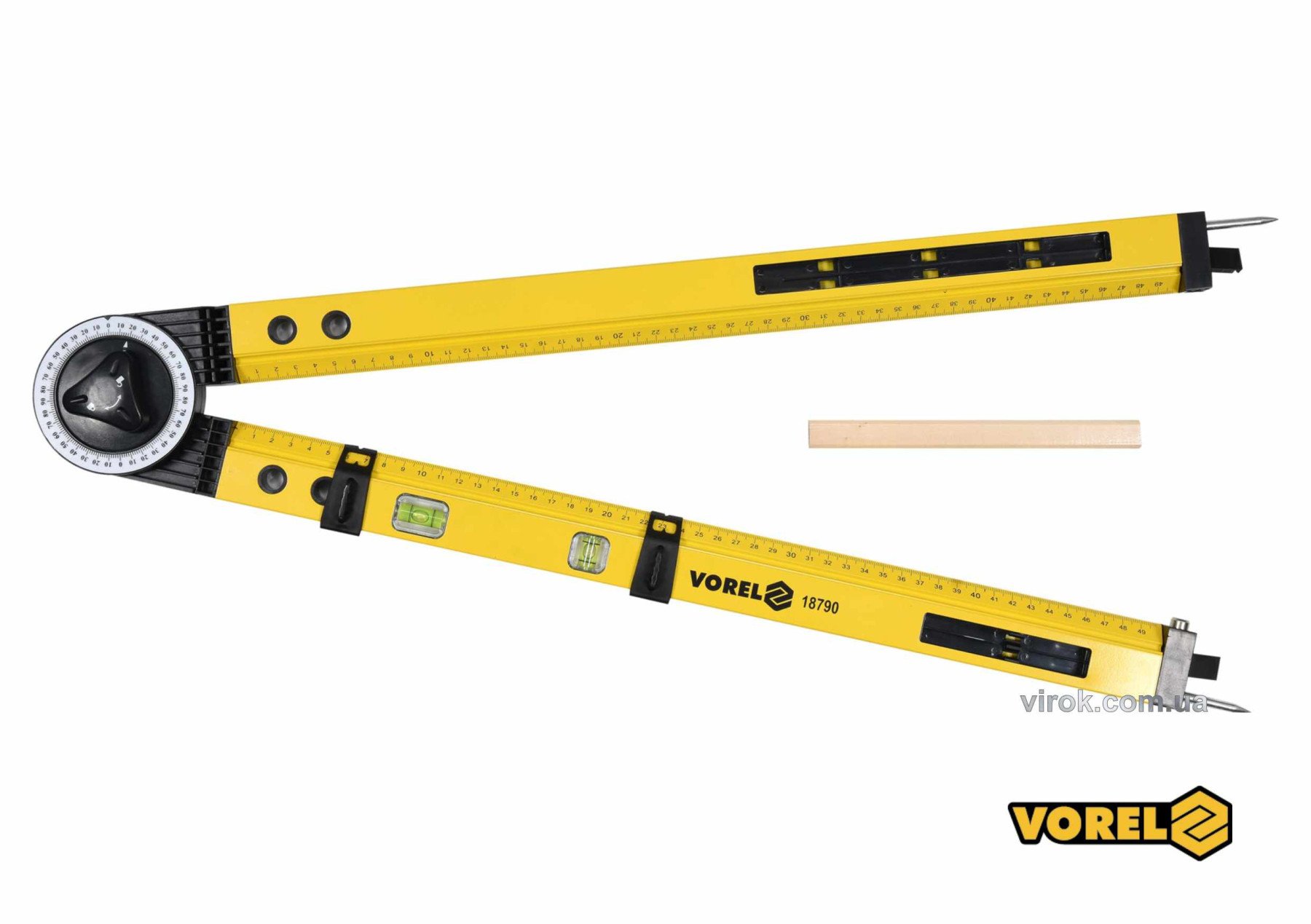 VOREL Кутомір регулювальний алюмінієвий : l=63мм, кут 0-270°, діапаз. 0-500мм, 2 капсули+олівець | 18790