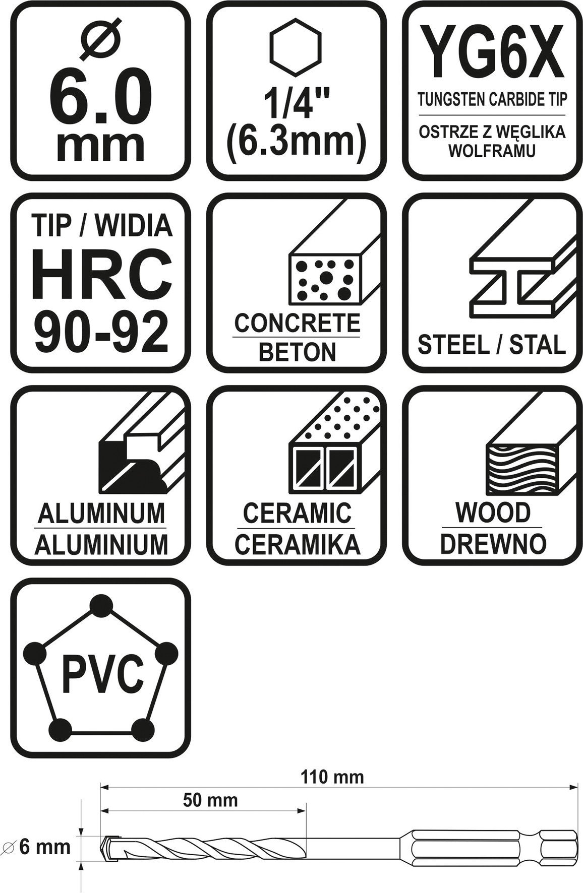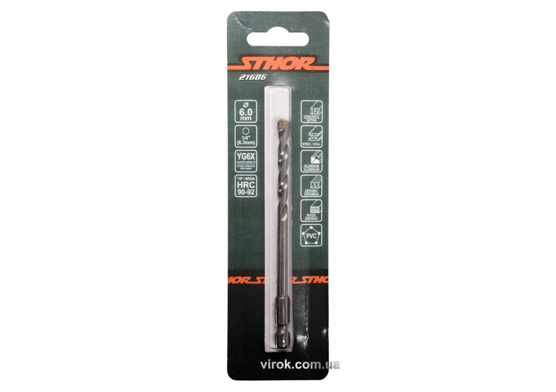 STHOR Свердло універсальне : YG6X, з 6-гран. хвостовиком-1/4", Ø= 6 мм, l= 110/50 мм | 21686