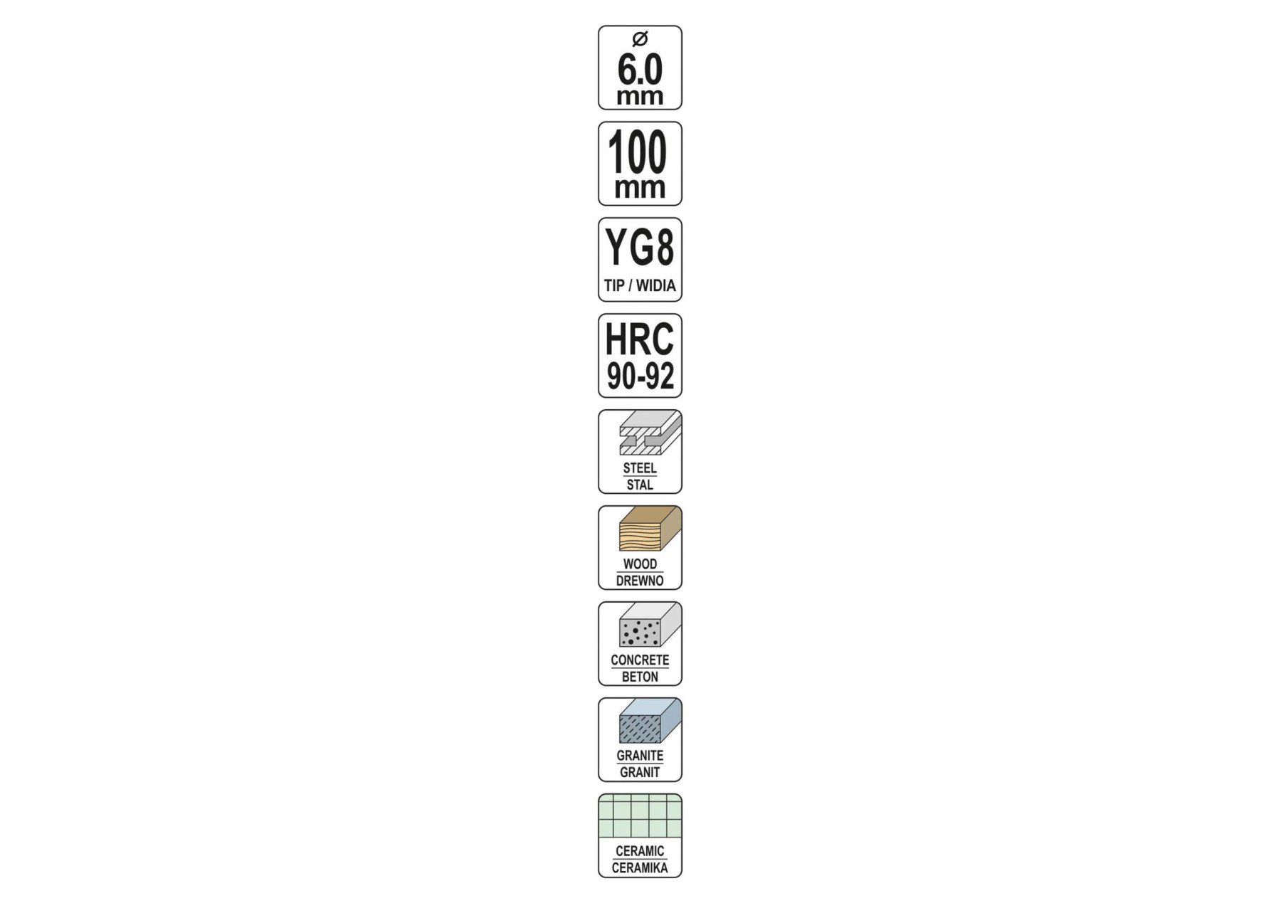 Свердло універсальне YATO : YG8, HRC 90-92, O= 6 мм, l= 100 мм