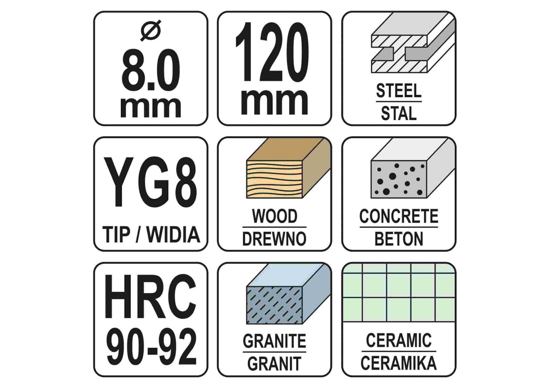 Свердло універсальне YATO : YG8, HRC 90-92, O= 8 мм, l= 120 мм