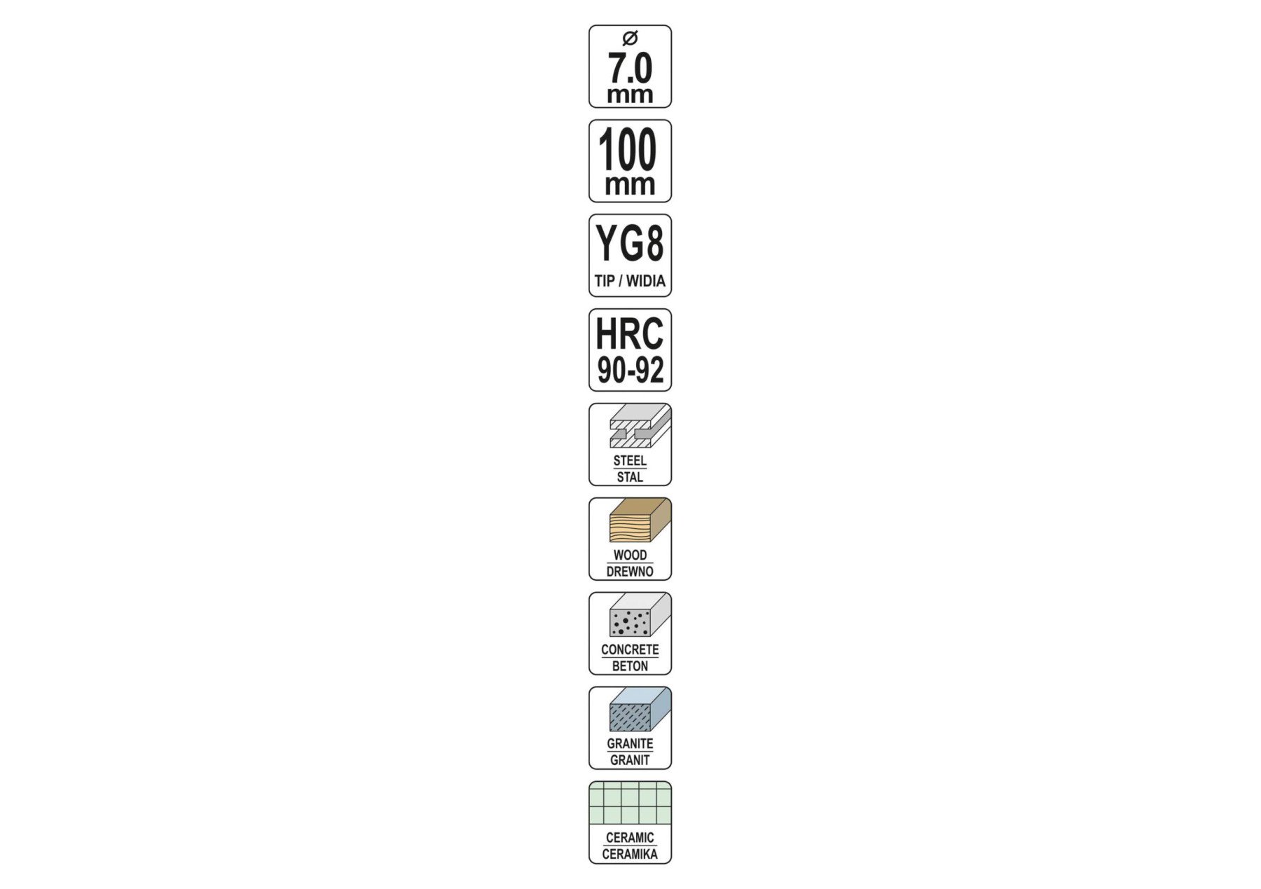 YATO Свердло універсальне : YG8, HRC 90-92, Ø= 7 мм, l= 100 мм