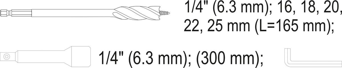 YATO Набір свердл по дереву : Ø=16-25 мм, L= 165 мм, з 4 пругами, HEX-1/4" + подовжувач + ключ, 7 шт