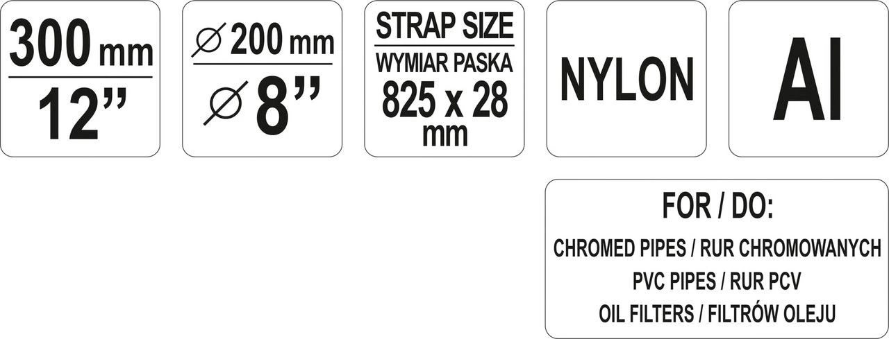 Ключ трубный ременной до 200 мм (8 дюймов). Использование очень прочного и долговечного нейлонового ремня длиной 825 мм и шириной 28 мм позволяет отвинчивать трубы диаметром до 200 мм (8 дюймов). Кроме того, это гарантирует, что поверхности открученных труб не будут поцарапаны.