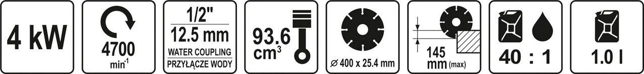 YATO Бензоріз по бетону і металу : 4 кВт, 4700 об/хв, диск Ø=400х25.4 мм, глибина різу- 145 мм