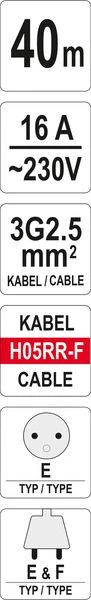 Высококачественный барабан на металлическом каркасе с резиновой ручкой и кабелем длиной 40 метров с 4 розетками. Кабель диаметром 10 мм имеет толстую резиновую изоляцию и изготовлен из 3 медных жил сечением 2,5 мм каждая. Такое сечение провода позволяет подключать к этому удлинителю одновременно 4 устройства к розеткам с заземлением и крышками, что особенно удобно на стройке, в мастерской или производственном предприятии. На стойке крепится резиновая ручка, которая облегчает транспортировку. Удлинитель оснащен тепловым предохранителем.