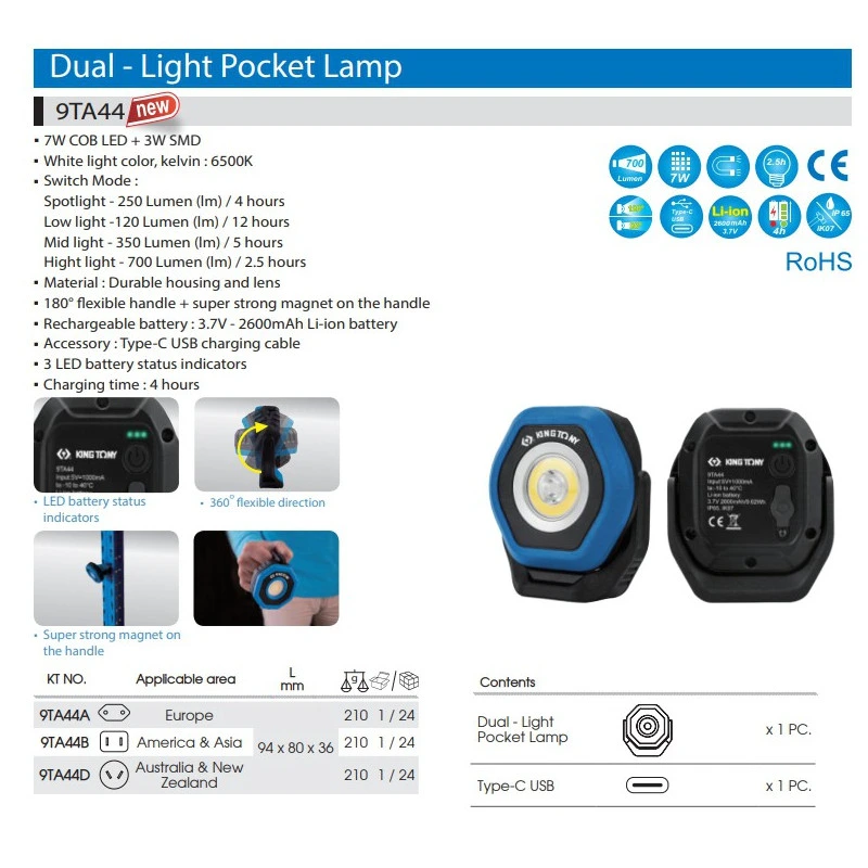 Фонарь KING TONY 9TA42A - это инспекционный фонарь, индивидуальный источник света, предназначенный для комфортного осмотра транспортных средств на станции техобслуживания или личном гараже. Очень удобный в эксплуатации, позволяет направить световой поток на необходимую область. Корпус изготовлен из качественного алюминия черного и голубого цвета, с уровнем защитой IP54, что означает защиту контактов от проникновеня пыли и грязи, а также защиту от брызг в любом направлении, таким образом его можно использовать во время дождя. Тонкий профиль с фиксируемой подставкой с возможностью регулировать наклон корпуса на 180 градусов.