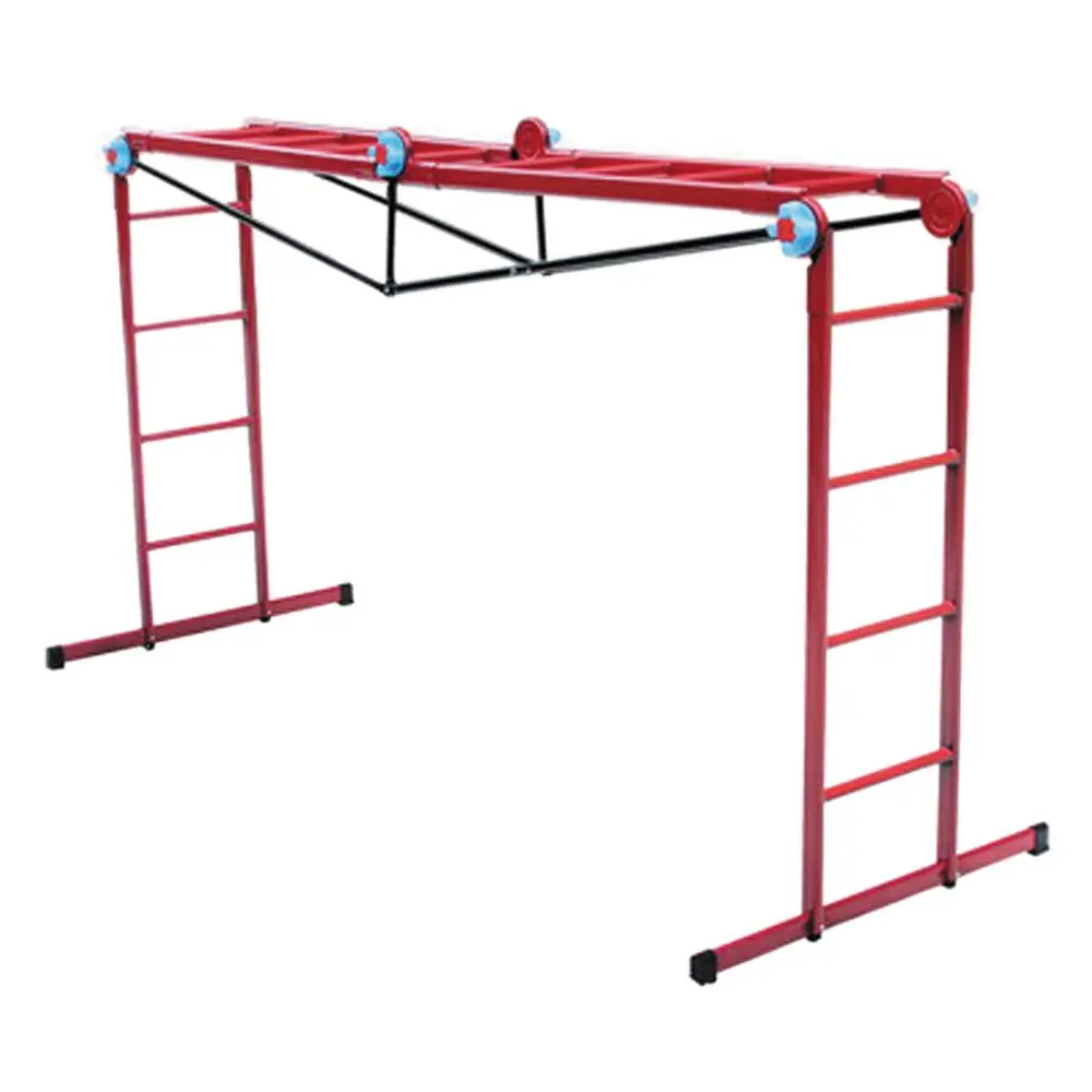 Лестница изготовлена из стальной плоскоовальной трубы толщиной стенки 0,8 и 1,0 мм. Оснащается двумя опорными тегами для лучшей устойчивости, а также тремя комплектами мощных фиксирующих замков. Комплектуется двумя металлическими фермами для дополнительной жесткости конструкции. Выдерживает вес до 120 кг. Конструкция лестницы стойкая и надежная. Случайное складывание невозможно. Способна выполнять функции приставной лестницы, Г-образной лестницы (удобно для фасадных и кровельных работ), М-образной (удобно для внутренних и отделочных работ на небольшой высоте). Трансформируется таким образом, что легко помещается в багажник легкового автомобиля.