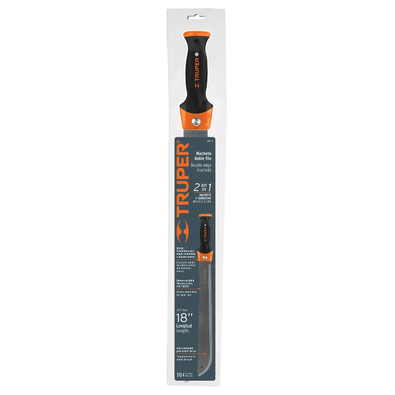 Мачете Double Edge, довжина 440 мм. Виготовлене з високоякісної інструментальної сталі S50C. Лезо товщиною 2 мм має антикорозійне покриття. Пилка зі зворотнього боку леза робить мачете незамінним помічником у туристичному поході, а також при зборі деяких сільськогосподарських культур. Ергономічна прогумована ручка забезпечує зручний та надійний хват.
