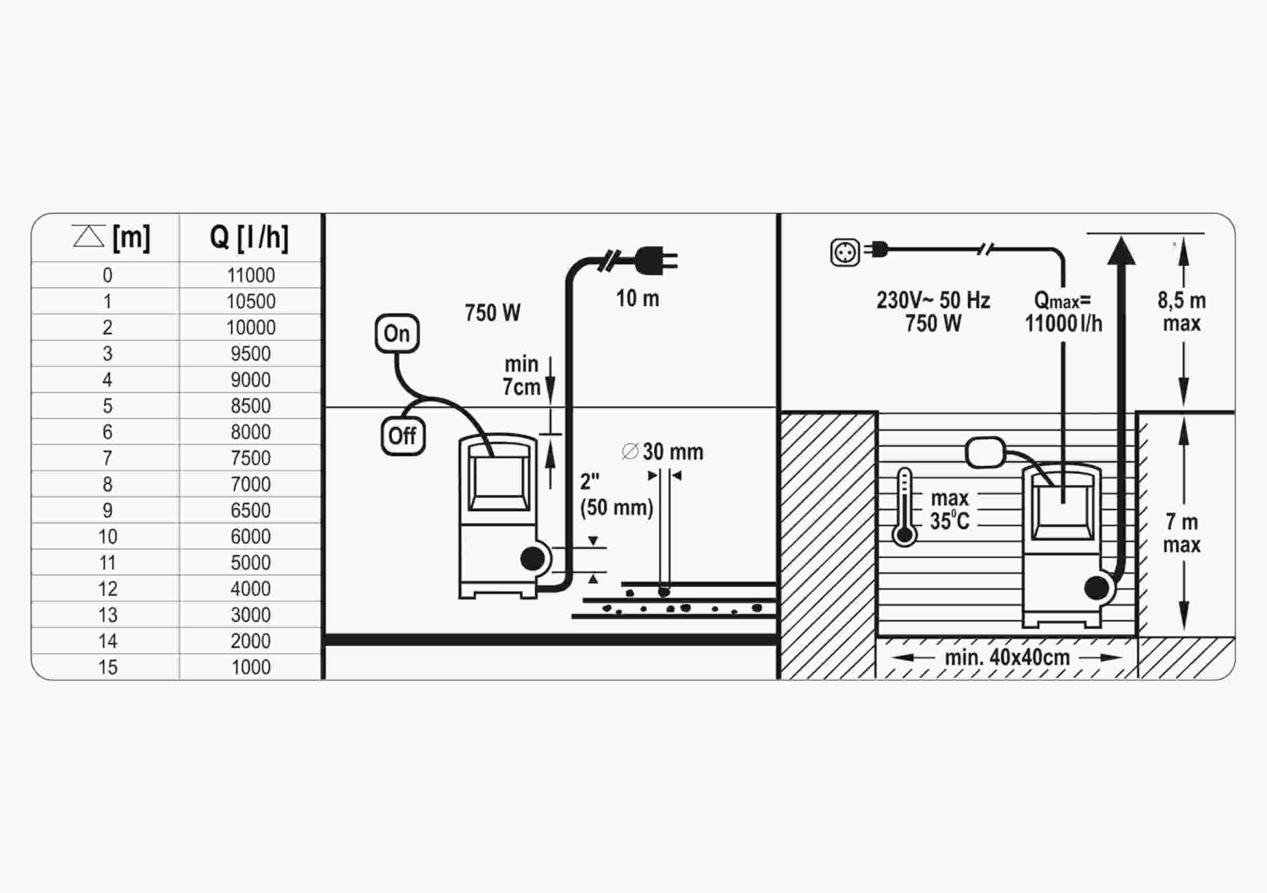 - Автоматичний поплавковый перемикач на бічній направляючій реагує на зміну рівня води від 5 мм – насос вмикається автоматично,забезпечуючи відкачування всієї води, без необхідності контролювати його роботу