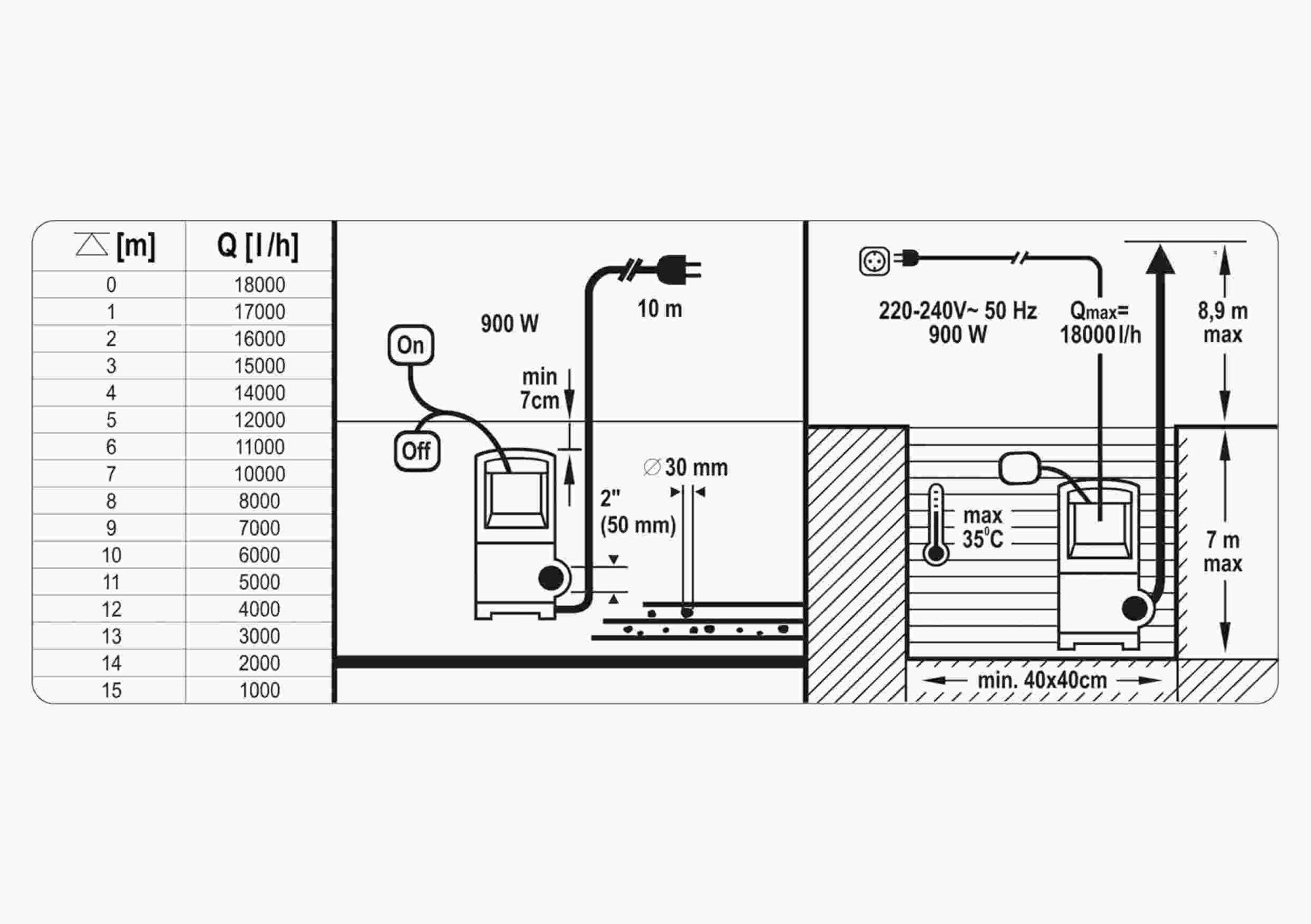 YATO Насос для брудної води мережевий : 900 Вт, 18000 л/год, макс.висота- 8.9 м, макс.глибина- 7 м
