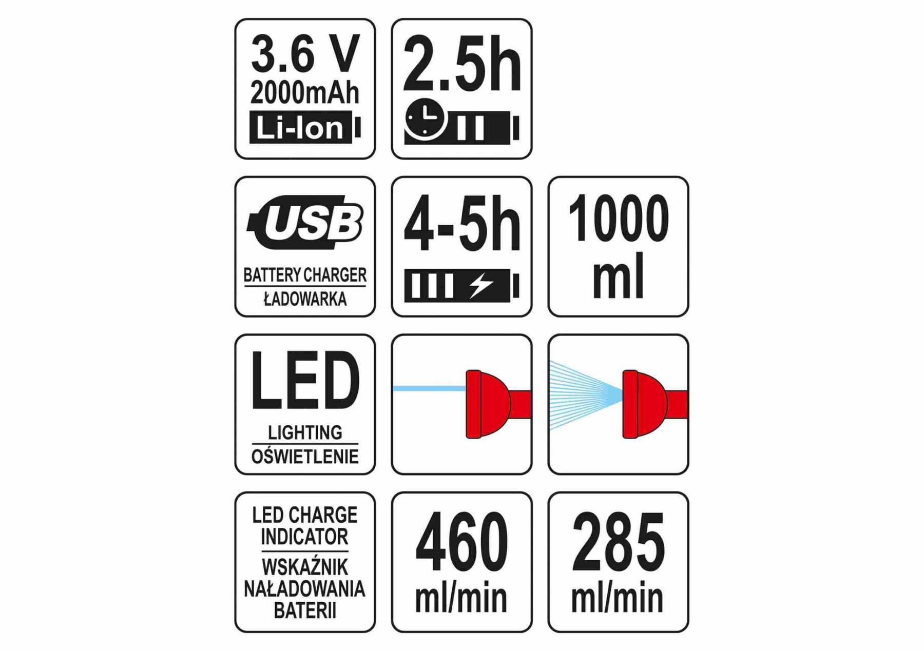 YATO Оприскувач акумуляторний : Li-Ion 3.6 В 2 Агод, бачок- 1 л, режим продуктивності- 285/460 мл/хв