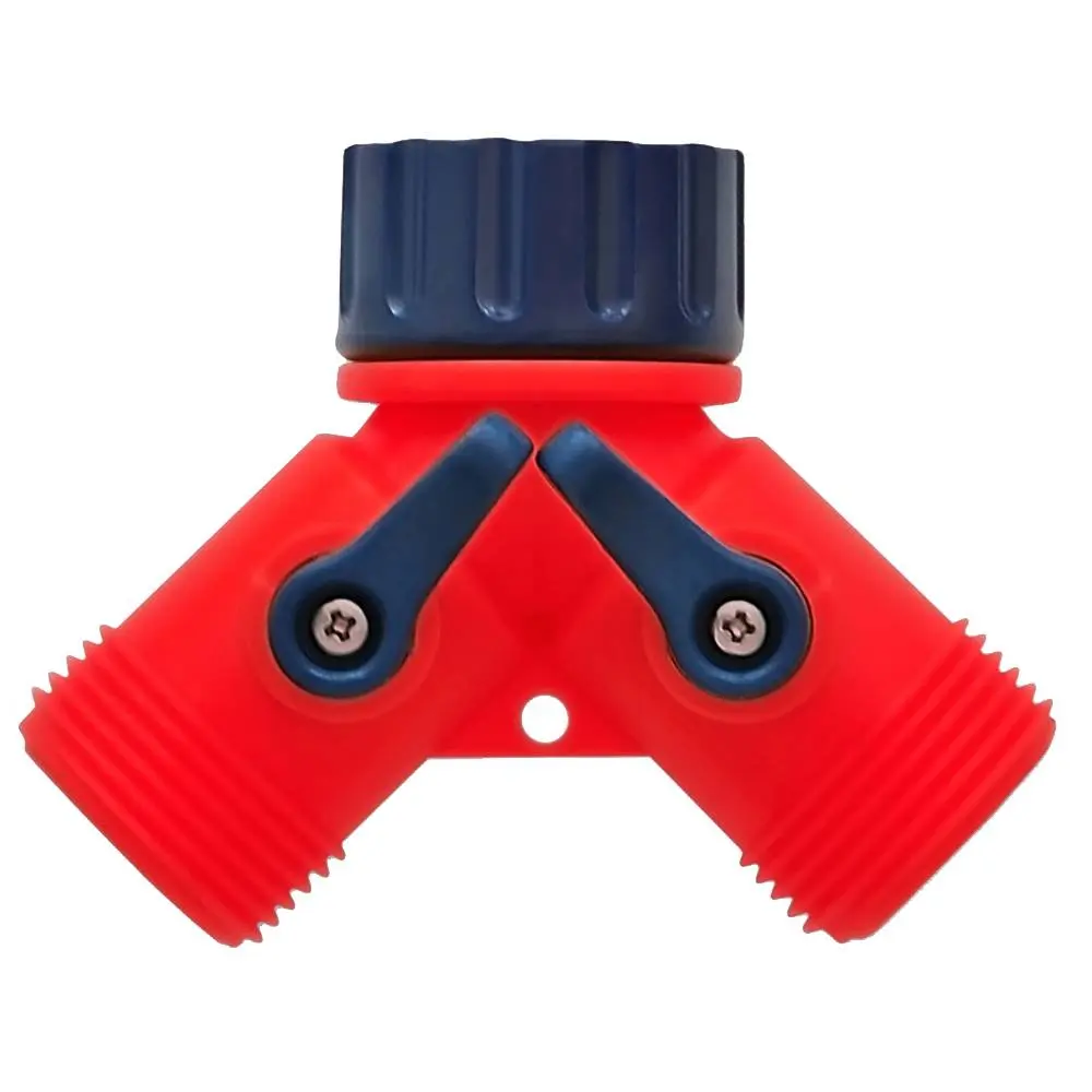 Розподільник 2-х канальний використовується в тому випадку, якщо необхідно зробити підключення двох шлангів або пристроїв для поливу (наприклад пістолет і розпилювач) до одного крану із зовнішнім різьбленням 3/4' одночасно. На кожен вихід накручується адаптер із внутрішнім різьбленням, до ніпеля підключається конектор зі шлангом. Кожен вихід дозволяє плавно і автономно регулювати потужність кожного потоку, або повністю вимкнути подачу води до відповідного шланга. Робочий тиск до 4 атмосфер. Розподільник виготовляється з якісного ABS пластика стійкого до механічних навантажень і ультрафіолетового випромінювання, має надійну конструкцію.