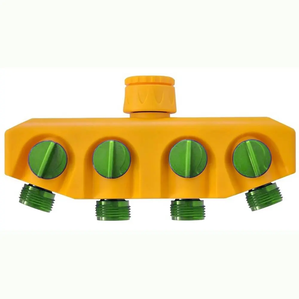 Розподільник 4-х канальний використовується в тому випадку, якщо необхідно зробити підключення 4 шлангів або пристроїв для поливу (пістолети та різноманітні розпилювачі) до одного крану із зовнішнім різьбленням 3/4' одночасно. На кожен вихід накручується адаптер із внутрішнім різьбленням, до ніпеля підключається конектор зі шлангом. Кожен вихід дозволяє плавно і автономно регулювати потужність відповідного потоку, або повністю вимкнути подачу води до відповідного шланга. Робочий тиск до 4 атмосфер. Розподільник виготовляється з якісного ABS пластика стійкого до механічних навантажень і ультрафіолетового випромінювання, має надійну конструкцію.