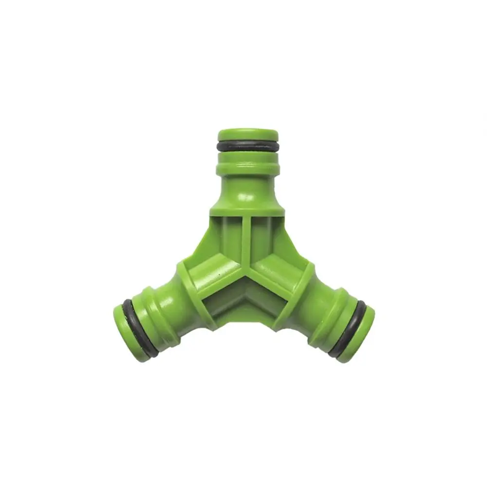 Трійник незамінний, якщо у Вас на ділянці тільки один водопровідний кран, а необхідно до поливального шлангу під'єднати два інструменти, або вам потрібно зробити розгалуження системи поливу від одного шлангу на два шланги з різними пристроями для поливу (наприклад пістолет і розпилювач). За допомогою цього трійника можна виконати розгалуження на два шланга і використовувати їх одночасно для різних робіт. Трійник підключається до конектора і дозволяє живити одночасно дві лінії поливу від одного джерела води. Робочий тиск до 4 атмосфер. Виготовляється трійник з якісного ABS пластику стійкого до механічних навантажень, дії розчинів добрив і ультрафіолетового випромінювання.