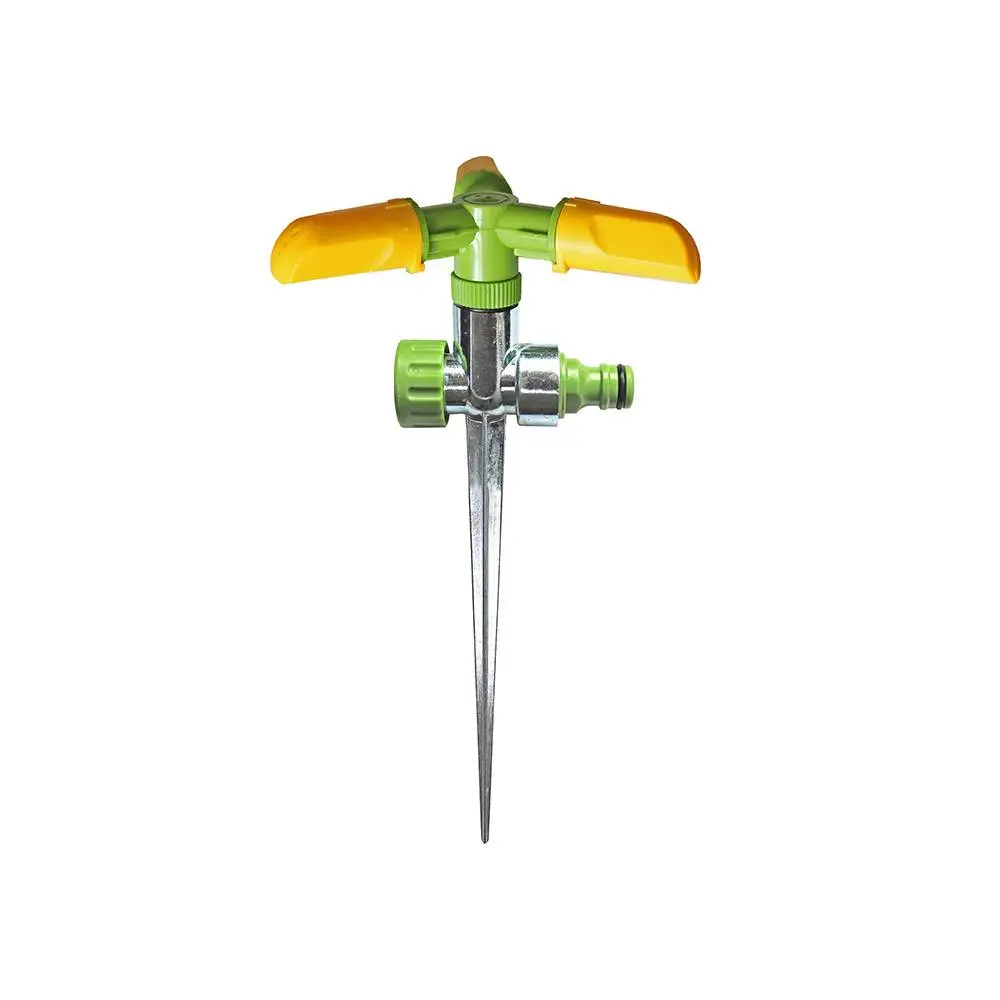 Розпилювач круговий на 3 сопла пластиковий на цинковому стрижні використовується для зрошення газонів середньої та невеликої площі, підійде так само і для поливу городу. Він розбризкує воду тонкими струменями, імітуючи природний невеликий дощ, і обробляє сектор ділянки захопленням 360°. Підключається до садових шлангів за допомогою конекторів. Рекомендований робочий тиск в системі від 2 до 4 атмосфер. Виготовлений з ABS пластика, довговічний, стійкий до впливу ультрафіолету і водорозчинних добрив. Простота установки, висока ефективність і рівномірність поливу, збереження оптимального рівня вологості грунту і повітря. Інструкція по монтажу: підключити садовий шланг через кран до джерела водопостачання, за допомогою коннектора підключити шланг до розпилювача, встановити розпилювач на місце поливу, подати воду в систему.
