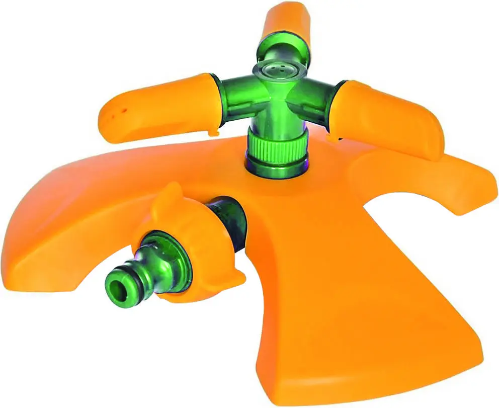 Розпилювач являє собою стійку круглу пластикову платформу з повнообертовим розпилювачем на 3 сопла, які розташовані у такий спосіб, щоб струмені, що викидаються, створювали єдиний потік води, та режимом поливу - коло. Виготовлений з якісного пластику ABS+PP. Призначений для зрошення ділянки навколо себе. Рекомендується для поливу невисоких рослин. Зміщені струмені створюють дуже гарний дощовий ефект. Вони ефективні, економлять час і ресурси. Практичні і зручні розпилювачі для поливу, при продуманій розстановці по ділянці, здатні створити ефективну зрошувальну систему з рівномірним розподілом води без калюж. Розпилювач стане гарним доповненням для садового господарства.