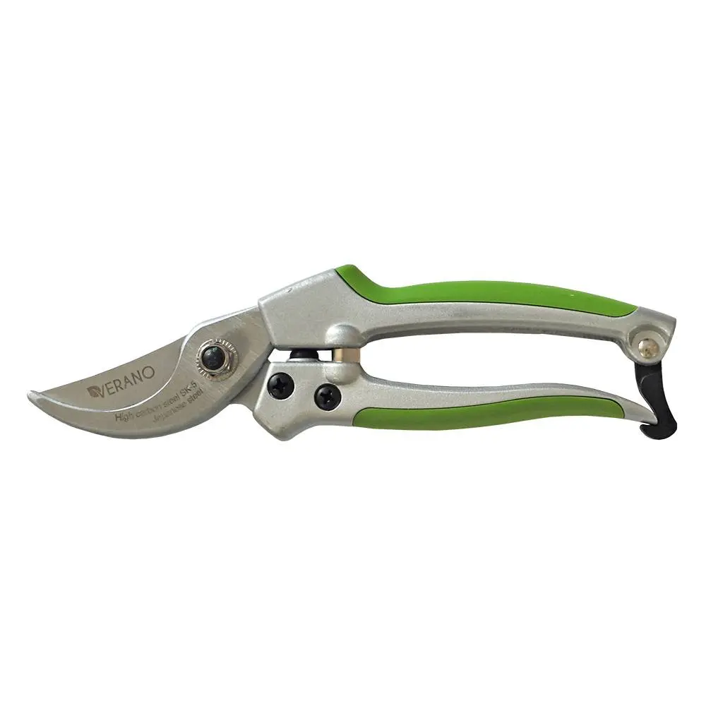 Потужний універсальний секатор довжиною 205 мм для широкого кола робіт з рослинами. Верхнє лезо - вісоковуглецева сталь SK5. Нижня лезо - середньовуглецева сталь S50C, хромована. Косий зріз до 20 мм. Стрічкова пружина. Алюмінієві рукоятки з TPR-накладками. Упор між рукоятками. Фіксатор - пластиковий накидной гачок на нижньому краю рукояток. Секатор призначений для обрізки живих гілок. Легкий чистий рез. Ергономічний дизайн. Надійний фіксатор (безпека в закритому положенні). Секатор призначений для професійного різання живих рослин, для обрізки пагонів і тонких гілок при проріджуванні дерев, кущів, також використовується при зборі квітів, фруктів і винограду.