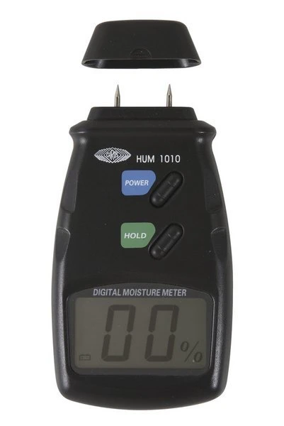 - два контакта электрода необходимо вдавить в поверхность древесины, и на ЖК-дисплее отобразится процент оставшейся влажности