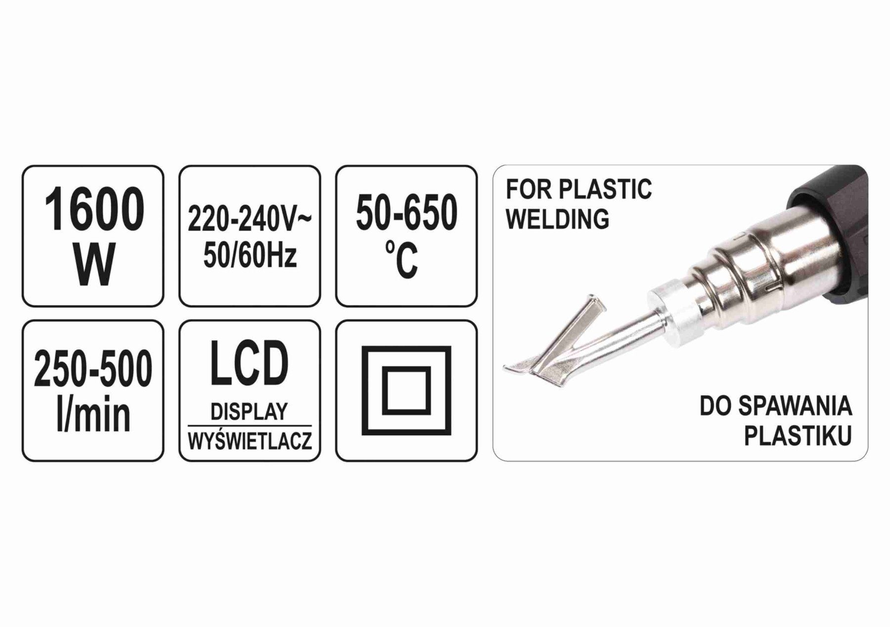 Будівельний фен YATO YT-82296 – електричний пристрій з ізоляцією II класу, з функцією зварювання і охолодження, призначений для зняття старих лакофарбових покриттів, зварювання пластмас, роботи з термоусадковими матеріалами при монтажі, професійної обв'язки кузовів авто та автомобільного скла.