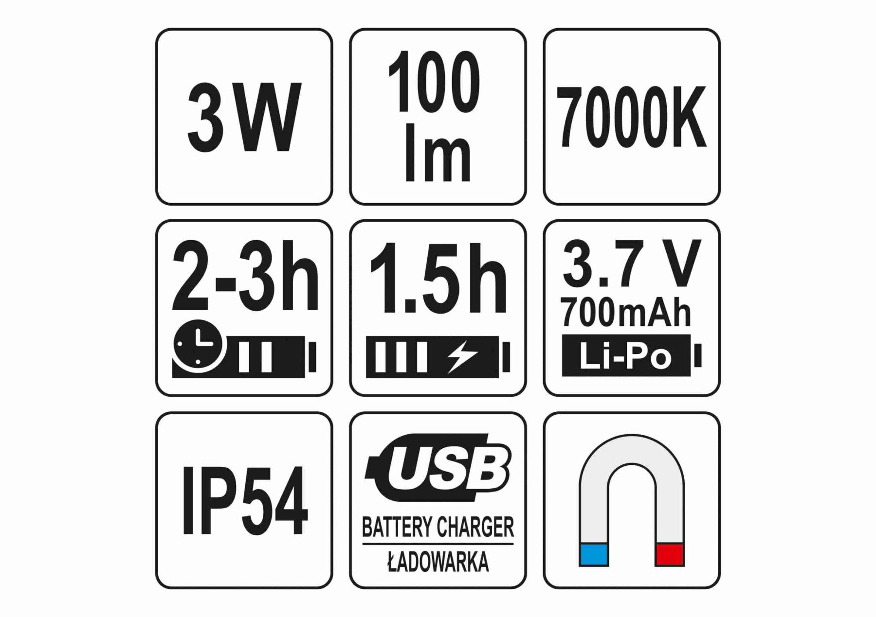 - Функції: настільна лампа / ліхтар / прожектор з гнучким тримачем / світильник для майстерні / магніт, який дозволяє утримувати металевий предмет