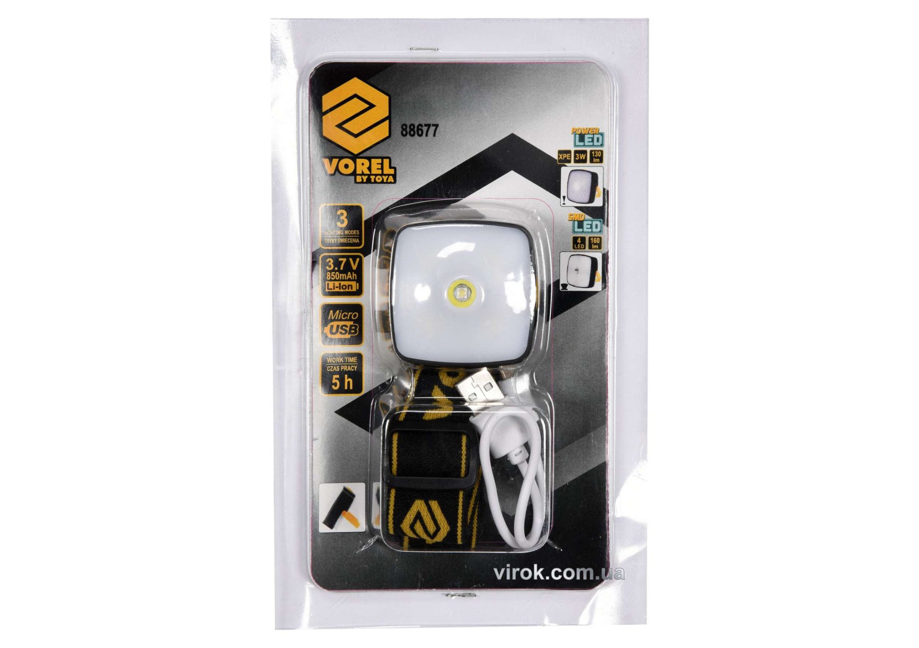 VOREL Ліхтар на чоло акумуляторний світлодіодний : 3Вт; Li-Ion 3,7В, 0,85A×Год, 3 режими, 130+160 lm | 88677