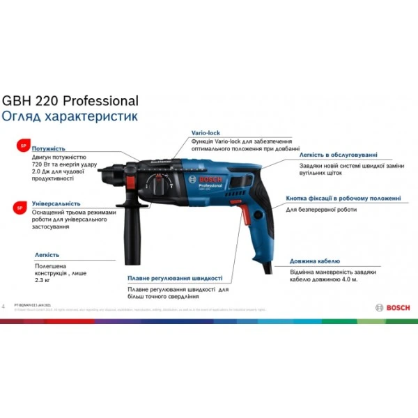 - Вага 2.3 кг Напруга живлення 220 В Потужність 720 Вт Габаритні розміри 334x88x205 мм Комплектація додаткова рукоятка (1619P16286), обмежувач глибини (2603001009), пластиковий кейс Швидкість обертання валу 2000 об/хв Енергія удару 2 Дж Кількість ударів 4800 уд/хв Патрон SDS-plus Режими роботи свердління, свердління з ударом, удар Діаметр свердління (дерево, пластик) 24 мм Діаметр свердління (метали та сплави) 12 мм Діаметр свердління (бетон, цегла) 22 мм Діаметр свердління коронкою (бетон, цегла) 68 мм -