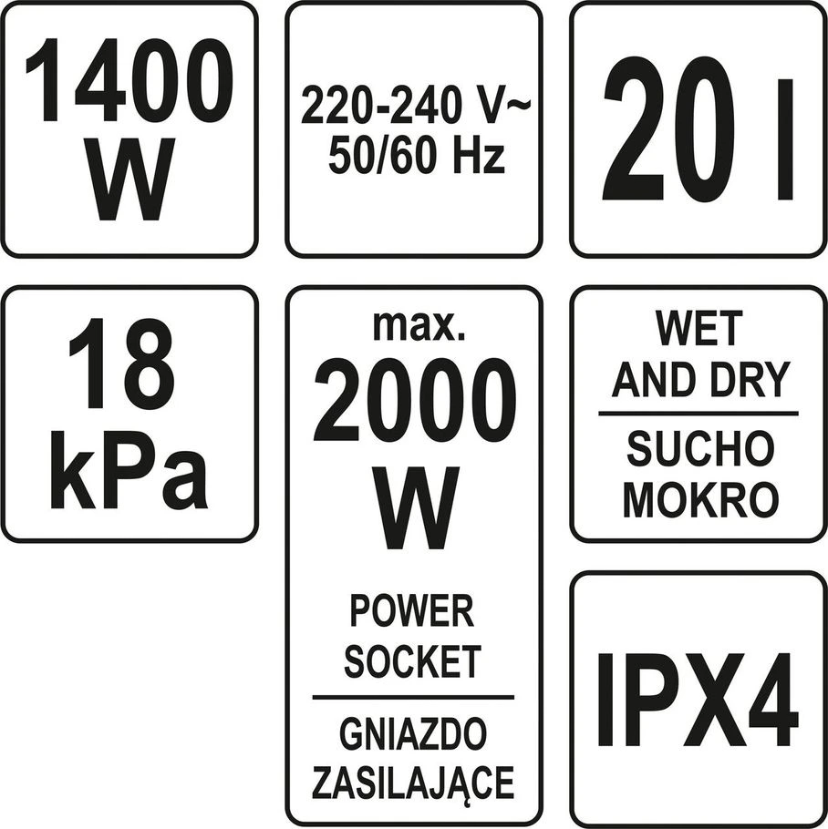 YATO Порохотяг промисловий мережевий : 1400 Вт, збірна ємність- 20 л