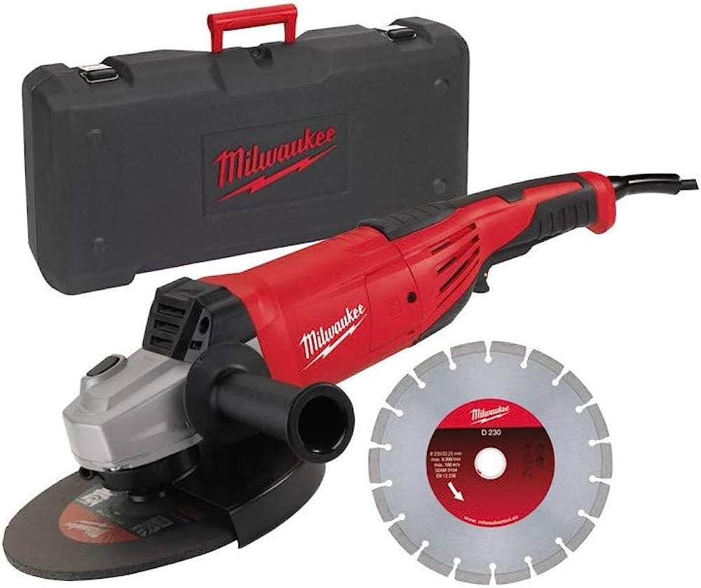 Комплект шліфувальної машини 4933440292 Milwaukee 2200 Вт, диск 230 мм, швидкість 6600 об/хв, різьблення М14. Комплект 4933440292 Milwaukee складається з болгарки потужністю 2200 Вт, алмазного диска та кейсу. Потужний двигун шліфувальної машини потужністю 2200 Вт забезпечує максимальну довговічність та стійкість до абразивного пилу. Завдяки зчепленню забезпечується максимальний захист у разі блокування диска. Максимальна маневреність гарантується завдяки довжині 485 мм та вазі 5,2 кг. Догляд за інструментом здійснюється швидко завдяки зручному доступу до щіток. Особливості продукту: Діаметр диска: 230 мм Швидкість без навантаження: 6600 об/хв Потужність: 2200 Вт Різьблення шпинделя: M14 Вага: 5,2 кг Максимальна глибина різу: 68 мм У комплект входить Захисний кожух, пластикова бокова рукоятка, фланець, фланцева гайка, кабель, ключ кейс Алмазний диск