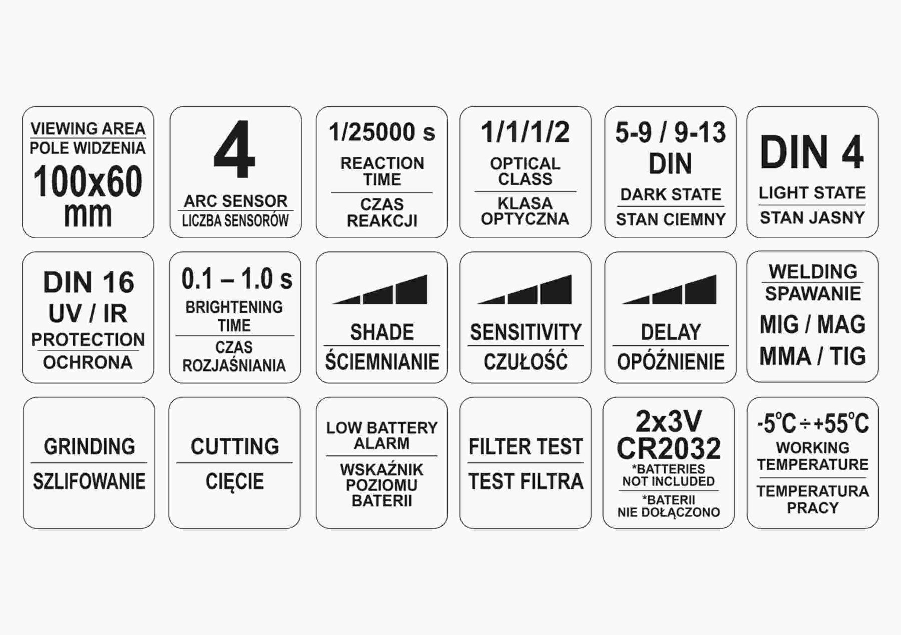 Высококачественная сварочная маска YATO YT-73926 оснащена самозатемняющим фильтром, защищающим от механических и световых факторов. Обеспечивает эффективную защиту зрения на уровне DIN 16 от ультрафиолетовых/ИК-лучей, возникающих при сварке и шлифовании.