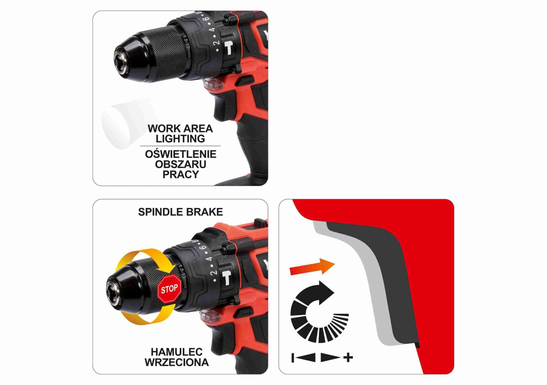 Дриль-шуруповерт з безщітковим двигуном і ударною функцією. Потужний двигун і масивна сталева передача (53-56 HRC) - це гарантія надійності та потужності при проведенні найскладніших робіт в екстремальних умовах. Сила удару і висока швидкість дозволяють швидко свердлити твердий бетон (макс. 12 мм), забивати довгі столярні шурупи (200 мм, біту PZ3, діаметр 5 мм) і навіть свердлити в металі та дереві корончатими свердлами з Bi-Metal. Світлодіодна лампа освітлює робоче місце. Короткий корпус сприяє сильному перпендикулярному тиску на матеріал під час свердління металу та закручуванні шурупів.