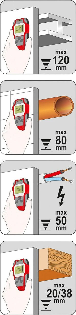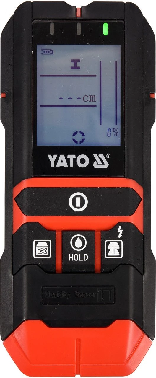 Использование влагометра YATO YT-73138 и счетчика 4-в-1 значительно ускоряет работу, повышает безопасность и сводит к минимуму риск случайного повреждения электрической или гидравлической установки, расположенной под штукатуркой. Благодаря этому вы можете, среди прочего смело просверлить отверстие или найти место для вкручивания шурупа в деревянный или металлический профиль, скрытый под гипсокартоном. Встроенный измеритель влажности позволит, среди прочего, определение уровня влажности штукатурки в тепловых мостах, а также проверка влажности древесины, предназначенной для топлива.