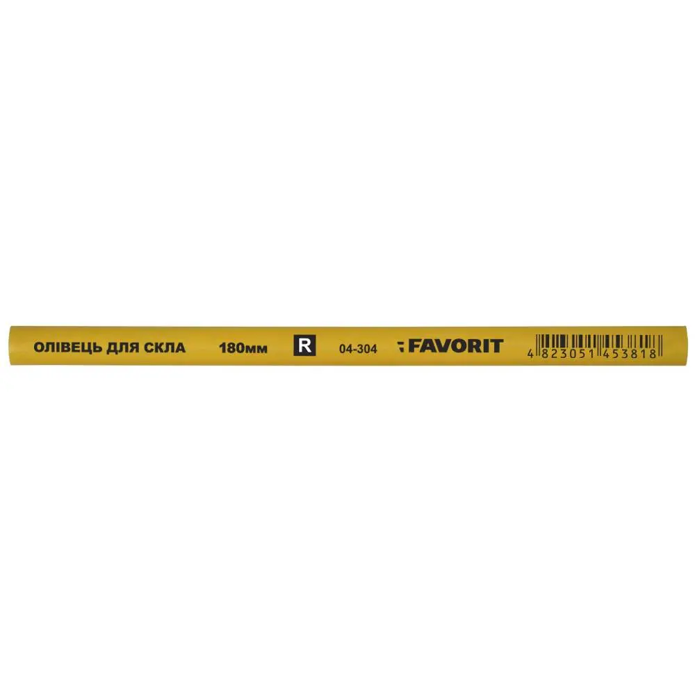 Олівець для скла. Олівець для скла має овальну форму, данна форма олівця запобігає його скатуванню з поверхні, надає зручність та полегшує його використання при роботі на похилих поверхнях. Олівець для скла має довжину 180 мм. Олівець для скла виготовлений з дерева, що надійно захищає грифельний стрижень при падіннях. Олівець для скла має грифельний стрижень R. Олівець для скла дозволяє наносити будівельні мітки на скло, керамічну плитку та інші гладкі поверхні при проведенні будівельних робіт, залишаючи при цьому чіткі мітки. За необхідності мітку можна зтерти з гладкої поверхні.