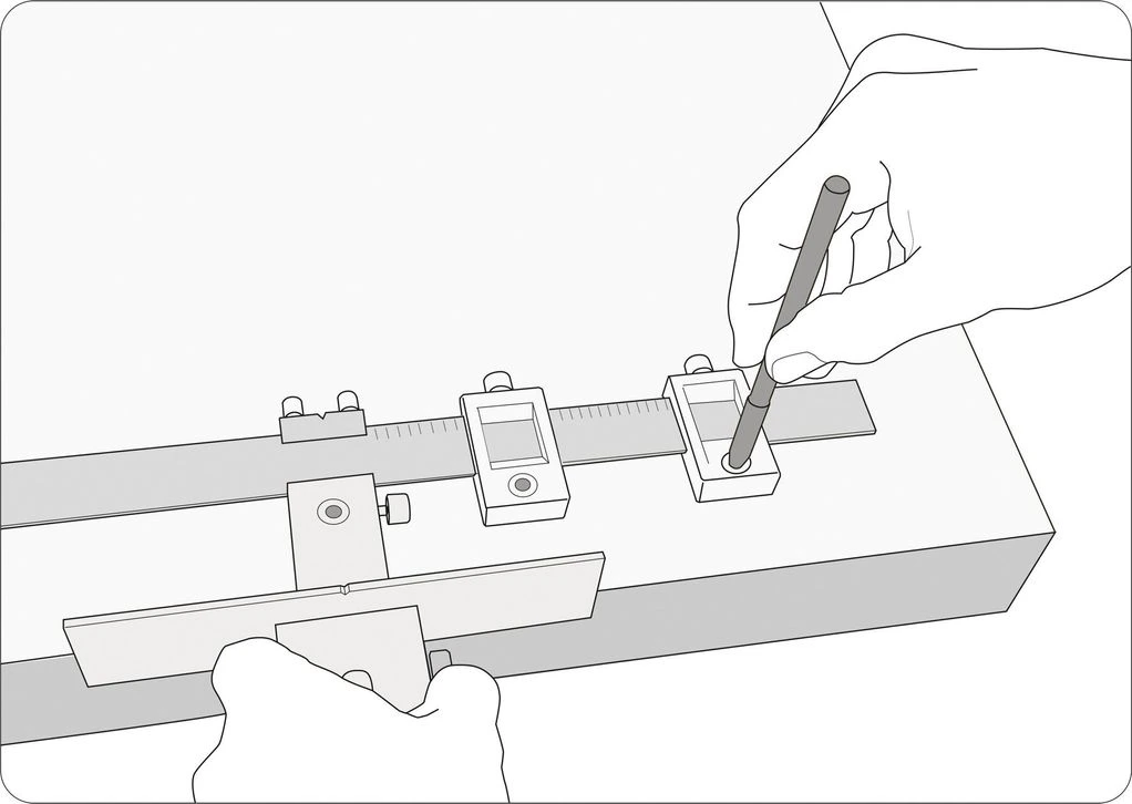 Основной рычаг изготовлен из алюминия, имеет постоянную миллиметровую шкалу до 250 мм и подвижный параллельный упор с винтовой фиксацией. В верхней части установлена подвижная стальная полоса, на которой используются три скользящих маркера для точного определения точек сверления.
