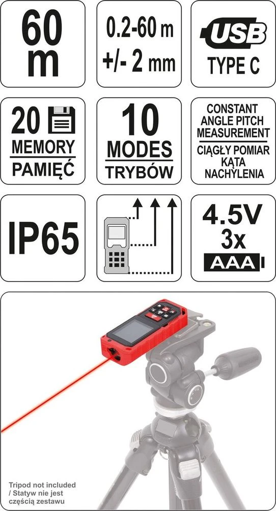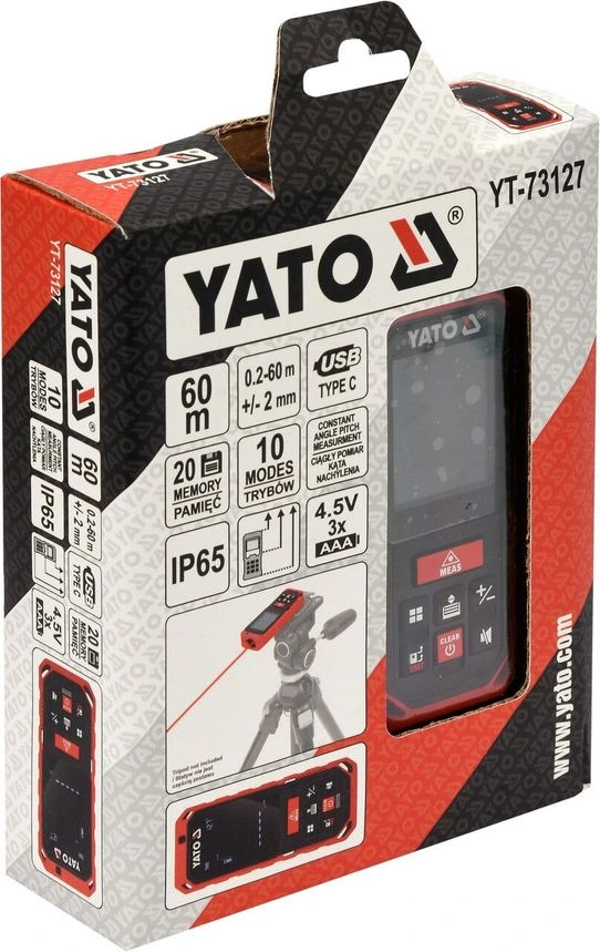YATO Дальномір лазерний, 10 режимів,з діапазоном 0.2- 60 м, похибка ±2 мм, 20 вимірів в памяті