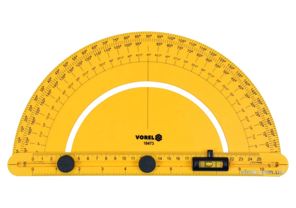 ТРАНСПОРТИР VOREL З ШКАЛОЮ 0-180º І РУХОМИМ РІВНЕМ L=250 ММ, З БЛОКУВАЛЬНИМИ ГВИНТАМИ