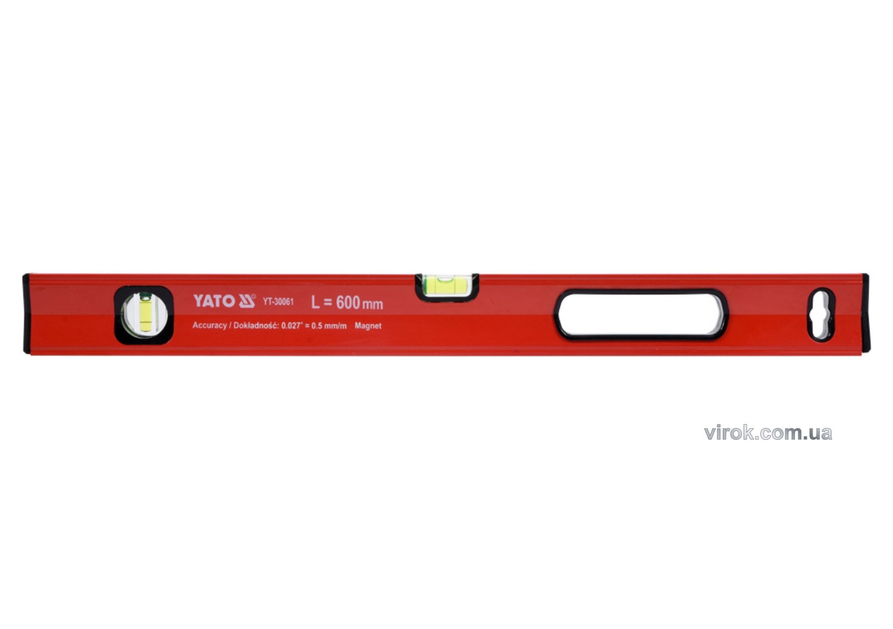 Рівень YATO YT-30061 – магнітний рівень виготовлений з алюмінієвого профілю. Оснащений двома флаконами з акрилового скла. Використовуючи новітні технологічні рішення в пробірці виходить чіткий ефект збільшувального скла. У нижній області на всій довжині знаходиться потужний магніт, що забезпечує сильну адгезію до сталевої поверхні.