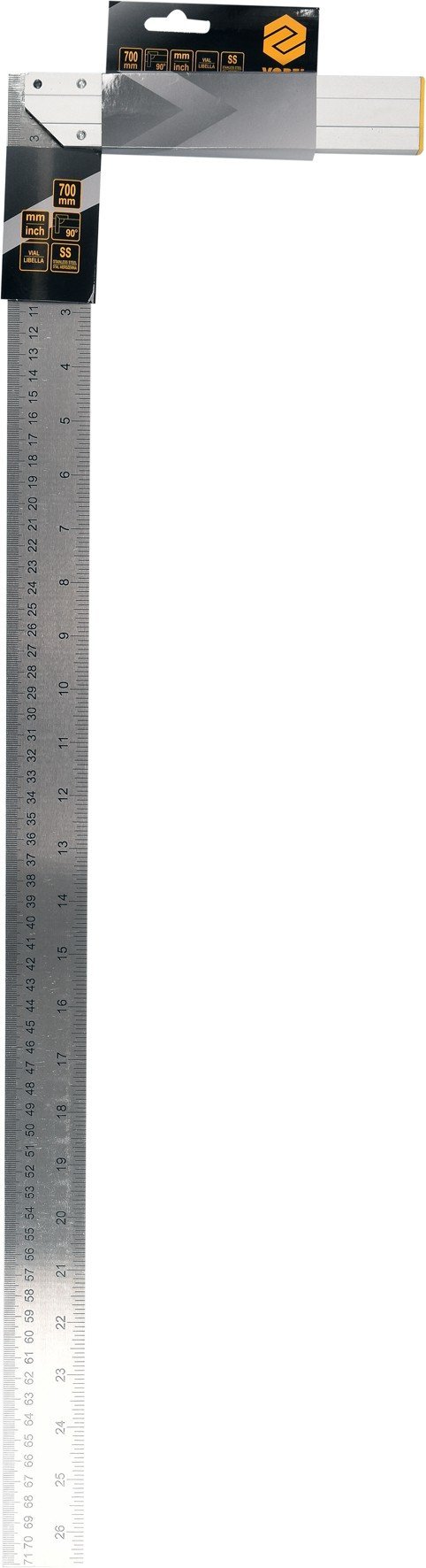Кутник з рівнем VOREL 700 мм/26.5', метрична і дюймова шкали, алюміній + сталь