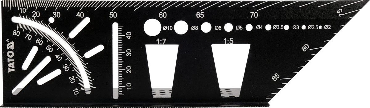 Пространственный угольник YT-70825 предназначен для столярных работ. Изготовлен из алюминия, края имеют миллиметровые деления. Размеры 150 х 70 х 215 мм, толщина 2,8 мм. Угольник включает шаблоны, используемые в столярных работах, например, ласточкин хвост, шаблоны отверстий, транспортир и другие. Обработка поверхности - черный анодированный.