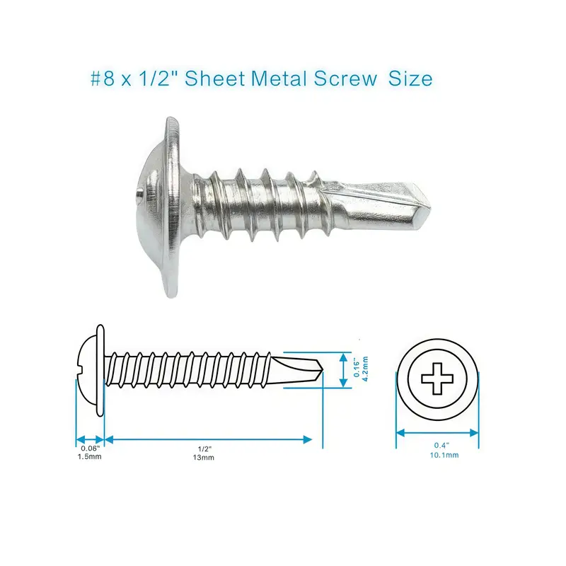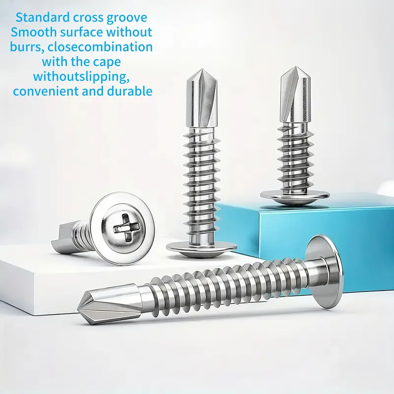 Саморез с пресс-шайбой из нержавеющей стали AISI 410, со сверловым наконечником и увеличенной грибовидной головкой — быстрый и надёжный монтаж без предварительного сверления. Идеален для конструкций, где важны прочность, аккуратный вид и высокая опорная поверхность головки.
