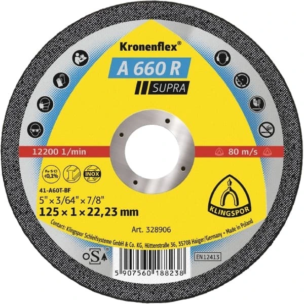- Зовнішній діаметр 125 мм Додатково клас: supra, зв'язок: синтетична смола, армована волокнами, зернистість: електрорунд, структурована форма: прямий Оброблюваний матеріал нержавіюча сталь, вуглецева сталь Діаметр посадкового отвору 22.23 мм Товщина 1 мм Швидкість різу 80 м/с Допустима швидкість обертання 12200 об/хв -
