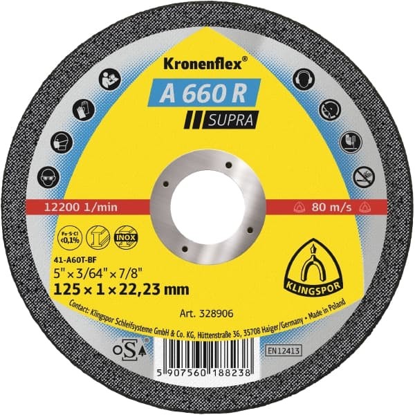 - Додатково клас: supra, зв'язок: синтетична смола, армована волокнами, зернистість: електрорунд, структурована форма: прямий Оброблюваний матеріал нержавіюча сталь, вуглецева сталь Товщина 1 мм Швидкість різу 80 м/с Допустима швидкість обертання 12200 об/хв -