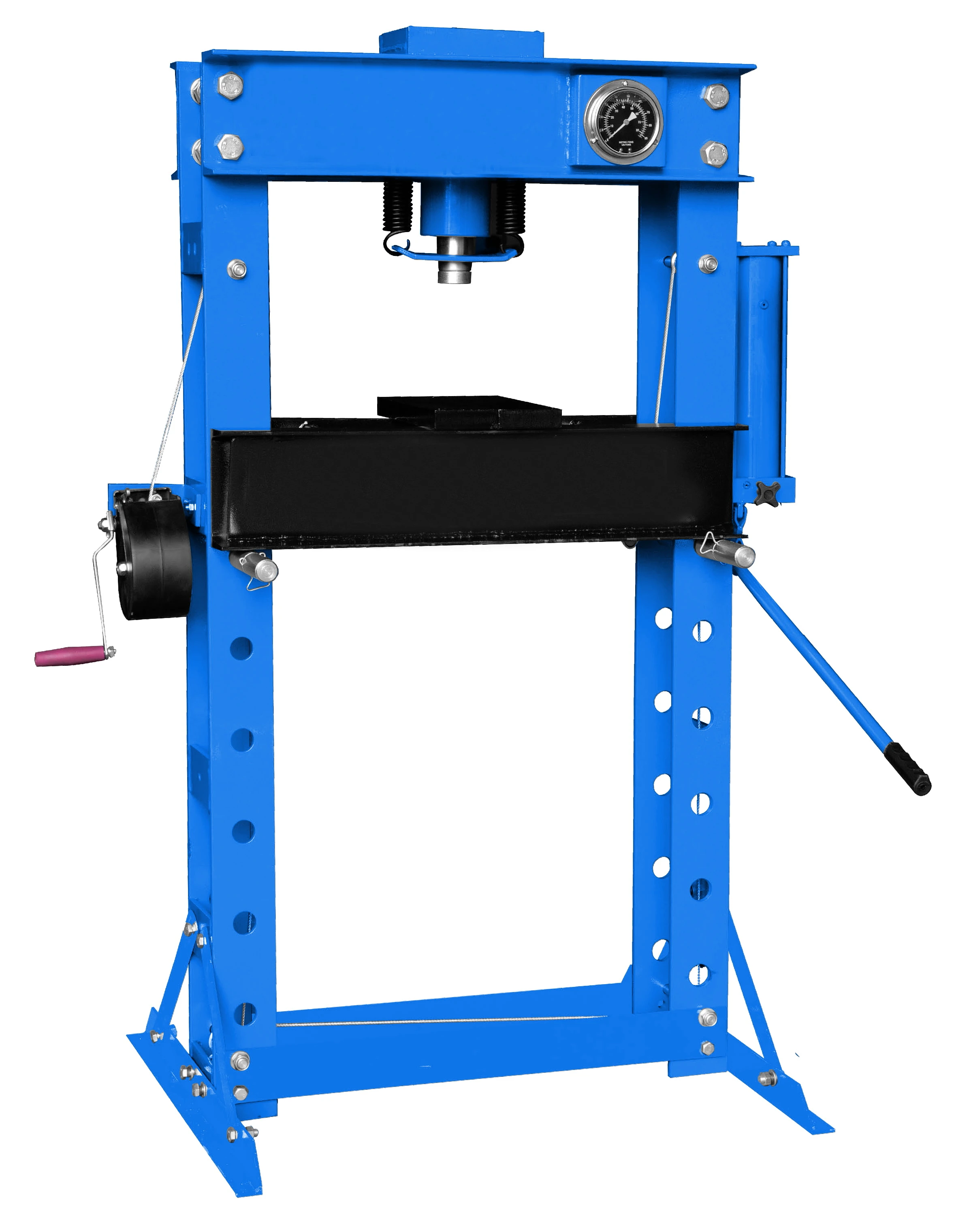 Ширина між колонами: 540 мм. Модифікація: Станіна із ручною лебідкою. Зусилля, що розвивається: 50,0 тн Привід: пневмогідравлічний Номінальний тиск: 8-9 атм Хід штока: 235 мм мін. робоча дистанція: 100 мм Макс. робоча дистанція: 885 мм Вага: 235 кг Габарити упаковки: 1880х940х400 мм Призначений для запресування, випресування, згинання та рихтування деталей. Тиск здійснюється за рахунок гідроциліндра, оснащеного ручкою нагнітання рідини. Верстат оснащений перепускним клапаном скидання тиску. Швидке встановлення поршня здійснюється додатковим гвинтом. Стіл легко опускається і піднімається за допомогою кривошипної рукоятки. Сторони рами відкриті для роботи з довгомірними матеріалами. Зручний циферблат манометра з великими цифрами показує зусилля натиску прикладеного до деталі. Пересувний гідроциліндр дає можливість працювати з великогабаритними агрегатами.