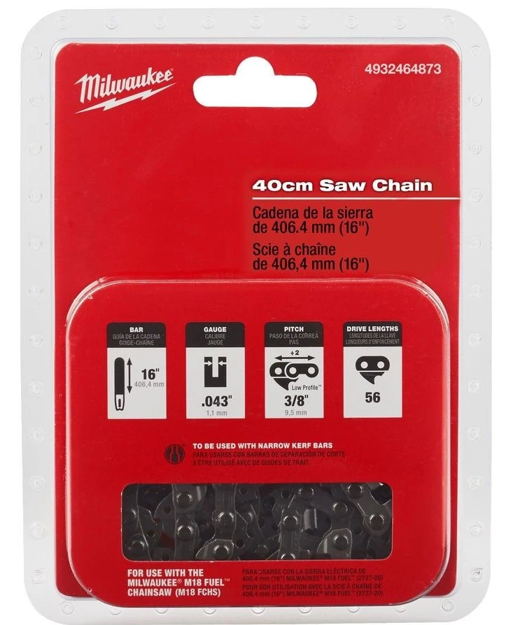 Опис Ланцюг довжиною 40 см Для роботи з ланцюговою пилкою Milwaukee M18 FCHS Характеристики: Довжина, см 40 Кількість сегментів 56 Крок зубів, мм 9.5 Комплект поставки: Постачається в блістері
