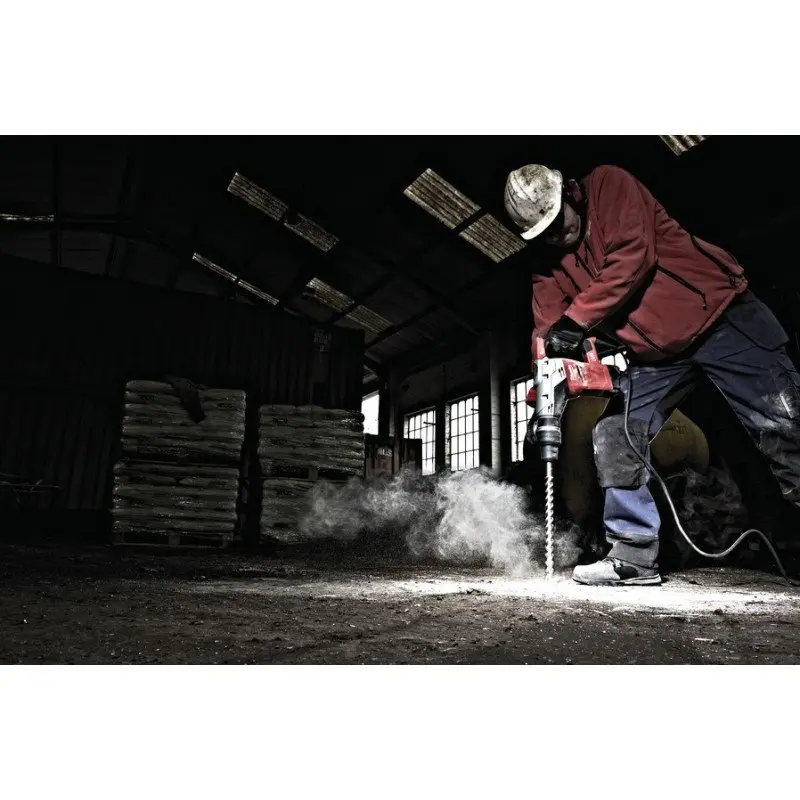 Потужність 1100; діаметр 40/100; енергія удару 7,5Дж; вага 6,3; 4м кабель; бічна рукоятка; мастило; кейс Особливості Найкраще співвідношення потужності та ваги у своєму класі - 7.5 J & 6.3 kg Висока потужність 1100 Вт та ефективна система тепловідведення гарантують максимальну надійність. М'який старт для прецизійного початку довбання/свердління Низький рівень вібрації дозволяє збільшити тривалість використання інструменту Міцний корпус редуктора з магнієвого сплаву захистить у важких умовах роботи, забезпечить точність складання елементів редуктора та гарантує хороше тепловідведення. Функція відключення удару та можливість вибору одного з 12 фіксованих положень долота дозволяють проводити довбіжні роботи при оптимальному куті повороту оснастки Запобіжна муфта захистить інструмент та оператора у разі заклинювання бура Покриття soft grip основної рукоятки Variolock (12 положень) для встановлення положення долота під різними кутами 4 м кабель Характеристики Потужність (Вт) 1100 Енергія удару (EPTA) (Дж) 7.5 Ударна дія при навантаженні (уд/хв) 3000 Швидкість при навантаженні (об/хв) 430 Макс. діаметр свердління в бетоні (мм) 40 Макс. діаметр тунельним буром (мм) 65 Макс. діаметр свердління коронками (мм) 105 Тип хвостовика SDS Max Ударне свердління (м/c2) 16.8 Рівень вібрації при довбанні (м/с2) 16.7 Вага (кг) 6.3 Постачається в Кейсі