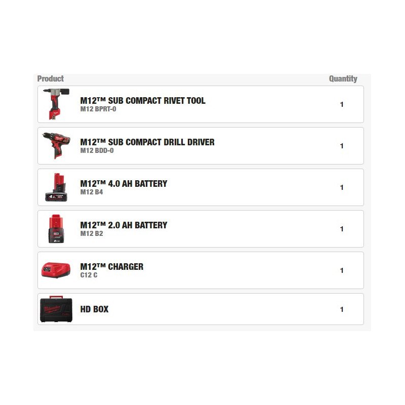 Набор электроинструмента Milwaukee: дрель M12BDD и заклепочник M12BPP2L + 2 аккумулятора, зарядное устройство, HD Box M12BPP2L-422X 4933481028
