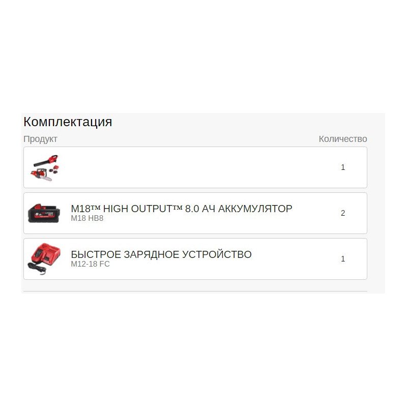 Набір садового інструменту M18FPP2OP2-802 POWER PACK OPE IN2 Бензопила Milwaukee M18 Fuel забезпечує потужність, яка перевершує роботу з бензиновими бензопилами у найвимогливіших умовах. Його технологія FUEL дозволяє пилці підтримувати швидкість у важких умовах роботи без зависання, що дає їй можливість перевершувати бензинові ланцюгові пилки до 40 куб.см. Тригер із змінною швидкістю дозволяє користувачеві мати повний контроль над кривою потужності, забезпечуючи миттєву реакцію дросельної заслінки для досягнення повної швидкості менше ніж за одну секунду. Паливна повітродувка Milwaukee M18 забезпечує удосконалений цифровий захист від перевантаження для інструменту та аккумулятора та унікальним чином підвищує продуктивність інструменту під навантаженням. Його ергономічний вбудований дизайн прибирає мусор та грязь у важкодоступних місцях за допомогою об'єму повітря до 12,74 м³/хв при швидкості 193 км/год. Акумулятор Milwaukee M18 High output 8,0Ah працює на 50% нижче, ніж інші акумуляторні батареї M18 REDLITHIUM, під час важких робіт, що дозволяє ремісникам використовувати свої бездротові інструменти сильніше та довше, ніж будь-коли раніше. Швидке зарядне пристрій Milwaukee M12-M18 заряджається в послідовності – першим входитиме, першим заряджається – що скорочує годину, потрібну для керування циклами заряджання. Що включено M18 FCHS - 40см Акумуляторна ланцюгова пилка M18 FUEL™ забезпечує більшу продуктивність, ніж бензинові ланцюгові пилки, для найскладніших завдань Технологія FUEL™ дозволяє підтримувати швидкість у складних умовах роботи без ризику заклинювання, що забезпечує кращі результати, ніж бензинові ланцюгові пилки до 40 куб. Система інструментів HIGH OUTPUT™ виводить технологію M18 FUEL™ на новий рівень та забезпечує підвищення продуктивності та часу безвідмовної роботи. Ці інструменти створені для максимальної сумісності із аккумуляторами HIGH OUTPUT™ Міцний металевий механізм забезпечує найкращий у своєму класі крутний момент. Тригер зі змінною швидкістю дає користувачеві повний контроль, запускаючи миттєву реакцію двигуна та досягаючи максимальної швидкості різання менш ніж за секунду Металеві шипи збільшують важіль під час різання Легкодоступний герметичний масляний бак із прозрачним оглядовим вікном У комплект входить олія 80 мл, сервісний ключ, кришка Гнучка аккумуляторна система гарантовано працює зі всіма аккумуляторами MILWAUKEE ® M18™ Повітродувка M18 FBL Безщітковий двигун MILWAUKEE ® POWERSTATE™ забезпечує підвищену ефективність, термін служби та максимальну потужність Інтелектуальна система REDLINK PLUS™ забезпечує розширений цифровий захист від перевантаження для інструменту та аккумулятора та унікальним чином підвищує продуктивність під навантаженням Ергономічна довгаста форма дозволяє легко удаляти грязь і пил з важкодоступних місць. Потужність видуваного повітря становить навіть 12,74 м³/хв на швидкості 193 км/год. Регулювання курок і блокування швидкості для повного контролю потужності Перемикач блокування Гнучка аккумуляторна система гарантовано працює зі всіма аккумуляторами MILWAUKEE ® M18™