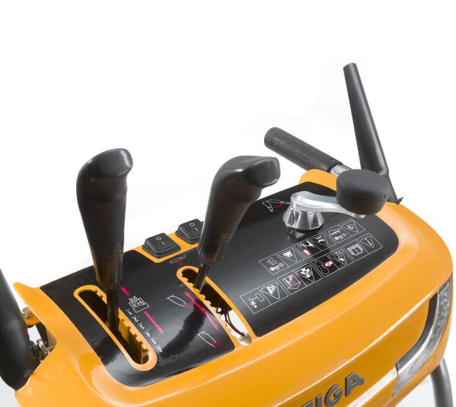 Самохідний снігоприбирач Stiga з двома колесами на гумовому ходу оснащений чотиритактним бензиновим двигуном. Потужність мотора становить 250 см.куб. (6,8 к.с.). Двигун запускається електричним стартером. Основний робочий елемент (металевий шнек) дозволяє прибирати смугу снігу шириною 66 см і висотою замету до 51 см. Найбільша дальність викиду снігу становить 12 метрів. Агрегат має вісім режимів передач (6 вперед і 2 назад). Для того, щоб під час очищення снігу не мерзли руки, конструктори бренду передбачили підігрів ручок управління агрегатом. Світлодіодні яскраві фари дозволяють проводити прибирання снігу в темний час доби. Агрегат також оснащений захистом від перевантаження і управлінням спрямованості викиду сніжної струменя.