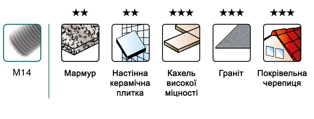 - Максимальний термін служби та відмінний результат при роботі з найтвердішими видами кахелю, черепиці та керамограніту.