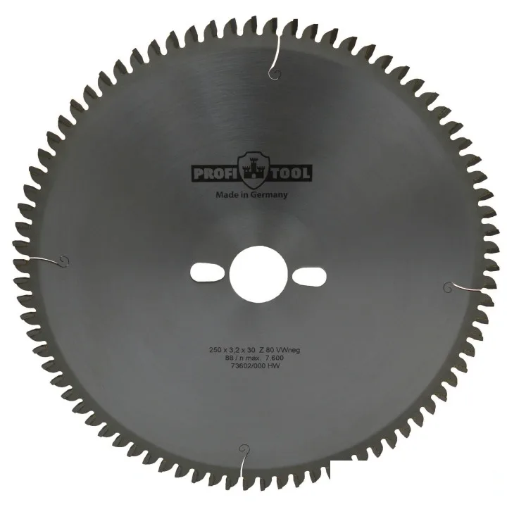 Артикул Діаметр, мм Ширина різання мм Товщина диска, мм Посадка, мм Кількість зубців, шт Форма зубця Бокові отвори 2121007 210 2,8 1,8 30 24 Wneg 2/7/42 2121008 210 2,8 1,8 30 48 Wneg 2/7/42 2121602 216 2,8 1,8 30 24 Wneg 2/7/42 2121603 216 2,8 1,8 30 48 Wneg 2/7/42 2121604 216 3,0 2,0 30 60 Wneg 2 KNL 2121605 216 2,8 1,8 30 80 Wneg 2/7/42 2125005 250 3,2 2,2 30 24 Wneg 2 KNL 2125006 250 3,2 2,2 30 48 Wneg 2 KNL 2125007 250 3,2 2,2 30 60 Wneg 2 KNL 2125008 250 3,2 2,2 30 80 Wneg 2 KNL 2126002 260 2,5 1,8 30 48 Wneg 2 KNL 2126003 260 2,5 1,8 30 60 Wneg 2KNL 2126005 260 2,5 1,8 30 80 Wneg 2 KNL 2130501 305 3,2 2,2 30 32 Wneg 2 KNL 2130502 305 3,2 2,2 30 60 Wneg 2 KNL 2130503 305 3,2 2,2 30 96 Wneg 2 KNL -